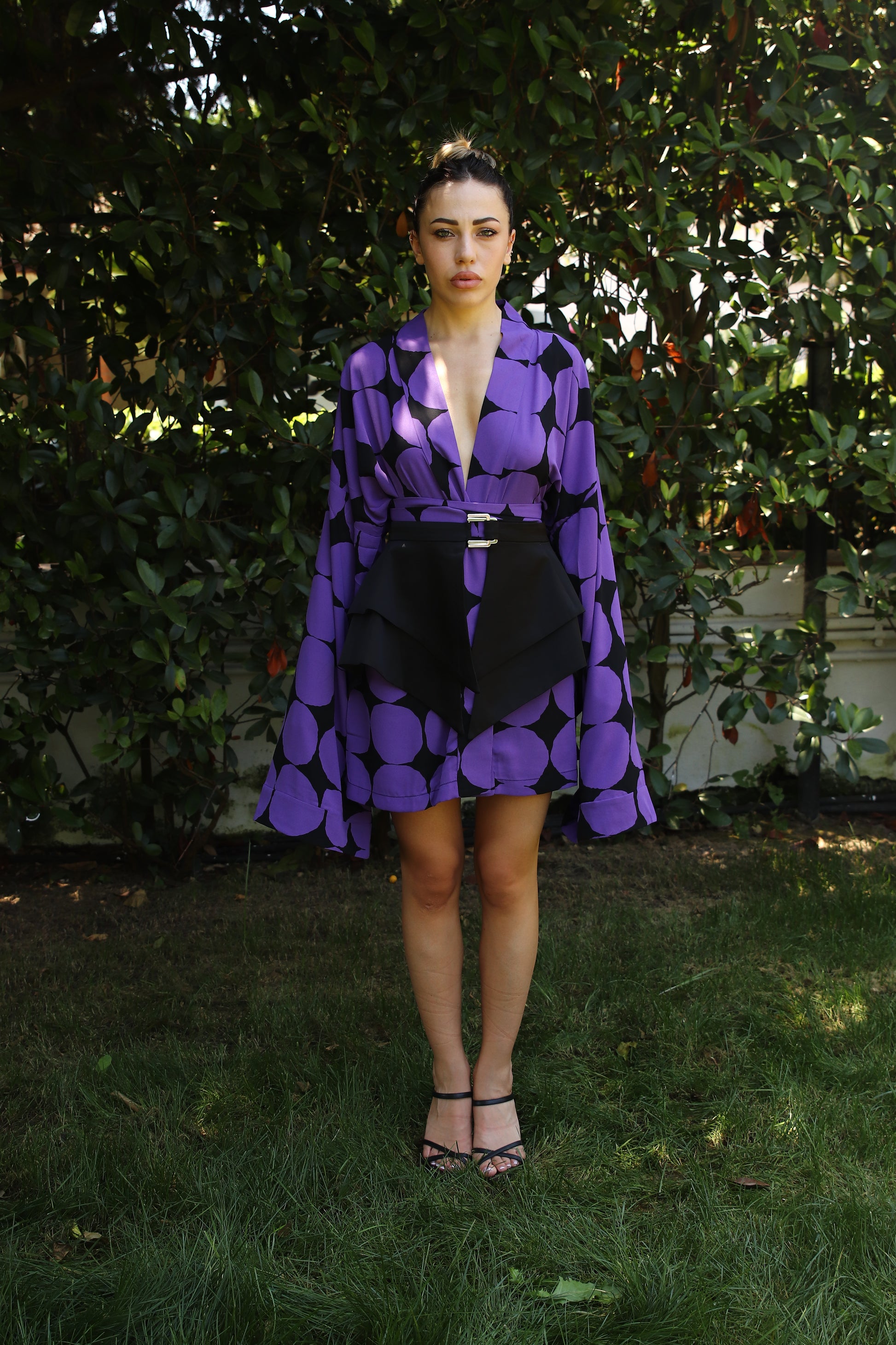 La modella in foto è taglia 40, alta 1,74 e indossa una taglia S.